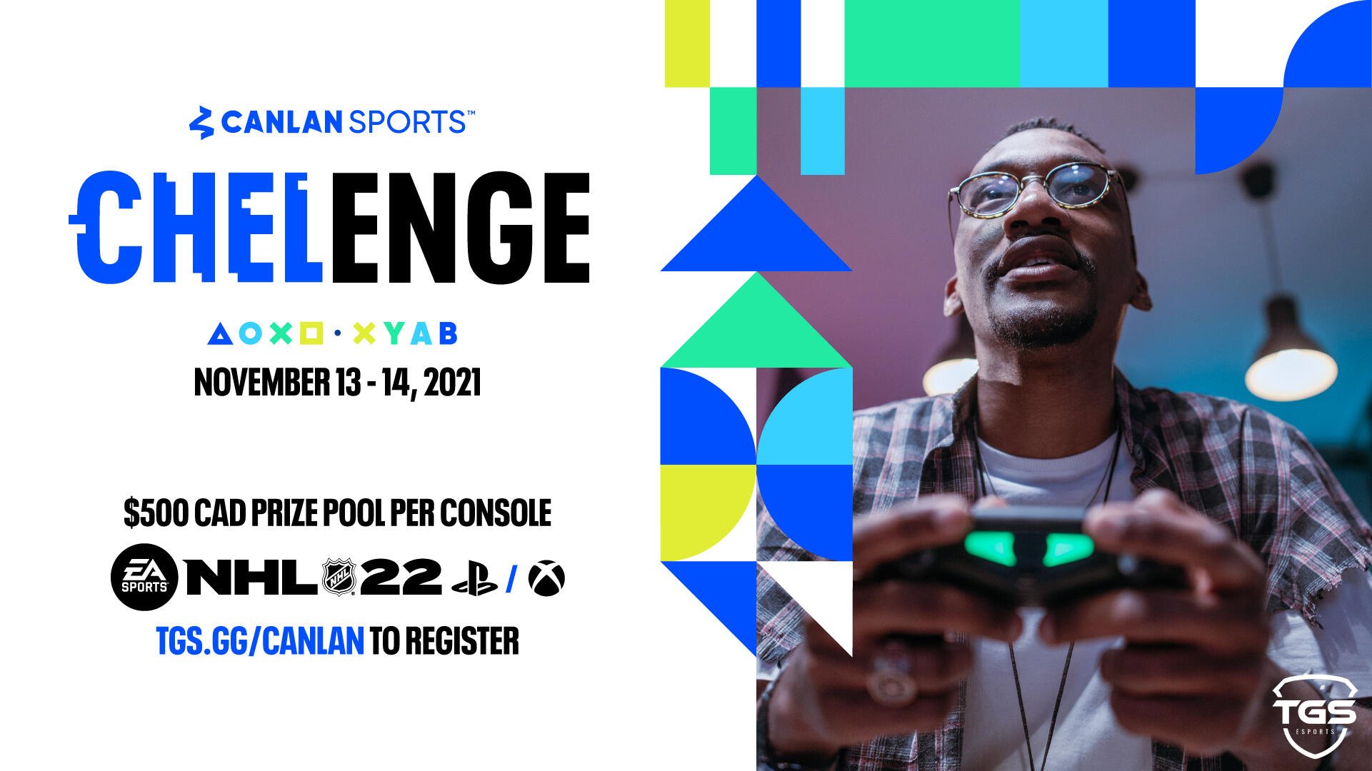 Canlan Sports dives into esports with Chelenge: an NHL 22 online esports tournament in collaboration, and partnership, with TGS Esports. Utilizing the ready-made Chelenge identity by Canlan and Canlan brand guidelines, broadcast and social media assets were to be developed. Core features of the Canlan identity were adapted to assets: brightly colored shapes, alternating text colors and use of familiar hierarchies as per guideline usage.Final deliverables included tournament graphics, social media promotional content, content addons, broadcast assets including animated visuals and completed showbuild as a VMix stream asset.