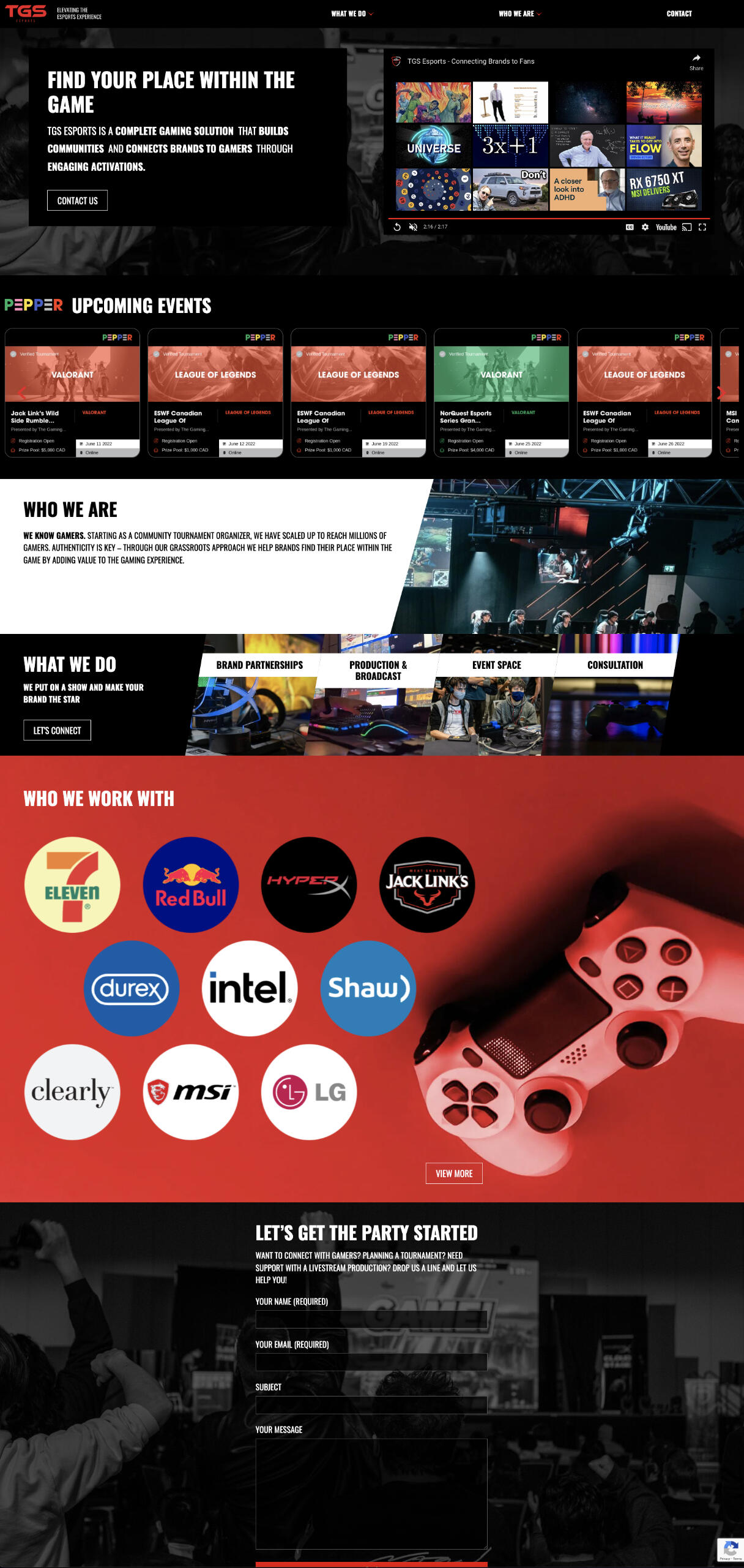 Transitioning from The Gaming Stadium to TGS Esports, a new site was in order to round out a brand refresh. Communicating new objectives, business direction, culture and discussing TGS Esports as the all in one gaming solution; elevating the esports experience. Pepper as a tournament organizing brand of TGS Esports is showcased front and center with a rotation of ongoing, available esports tournaments. TGS Esports highlights the store of who, what, why in a vibrant, new aesthetic and eloquently scrolls to a call to action: let’s get the party started, contact us.Completed product of the site design included, but were not limited to: redefined site map, complete desktop site design, curated event or gaming icons and photography, other imagery curation, definitive branding guidelines and general design consultation.see here