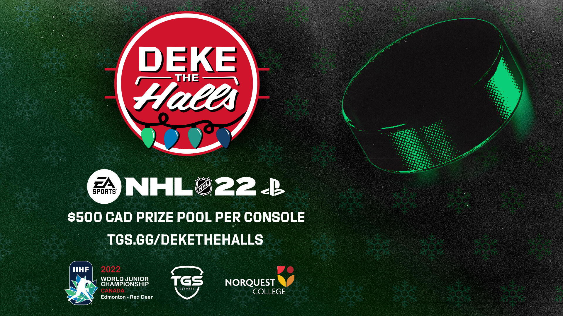 In collaboration with the IIHF for the World Junior Championship of Canada, TGS Esports hosted Deke the Halls: an online NHL tournament to mirror that of the real life tournament. Participating teams were also restricted to play teams exclusive to the World Junior as an added caveat to create a more robust experience surrounding the event. Branding developed to encapsulate holiday hockey, Deke the Halls derives from a favorite festive tune. A red circle emulates the holiday feeling, adorned by rope lights and placed within a familiar circle one might encounter in the rink. Traditional sports typography is used to emulate a classic hockey aesthetic alongside patterned, textured, festive assets for the full holiday hockey experience.Final deliverables included branding guidelines and identity, tournament graphics, social media promotional content, content addons, broadcast assets including animated visuals and completed showbuild as a VMix stream asset.