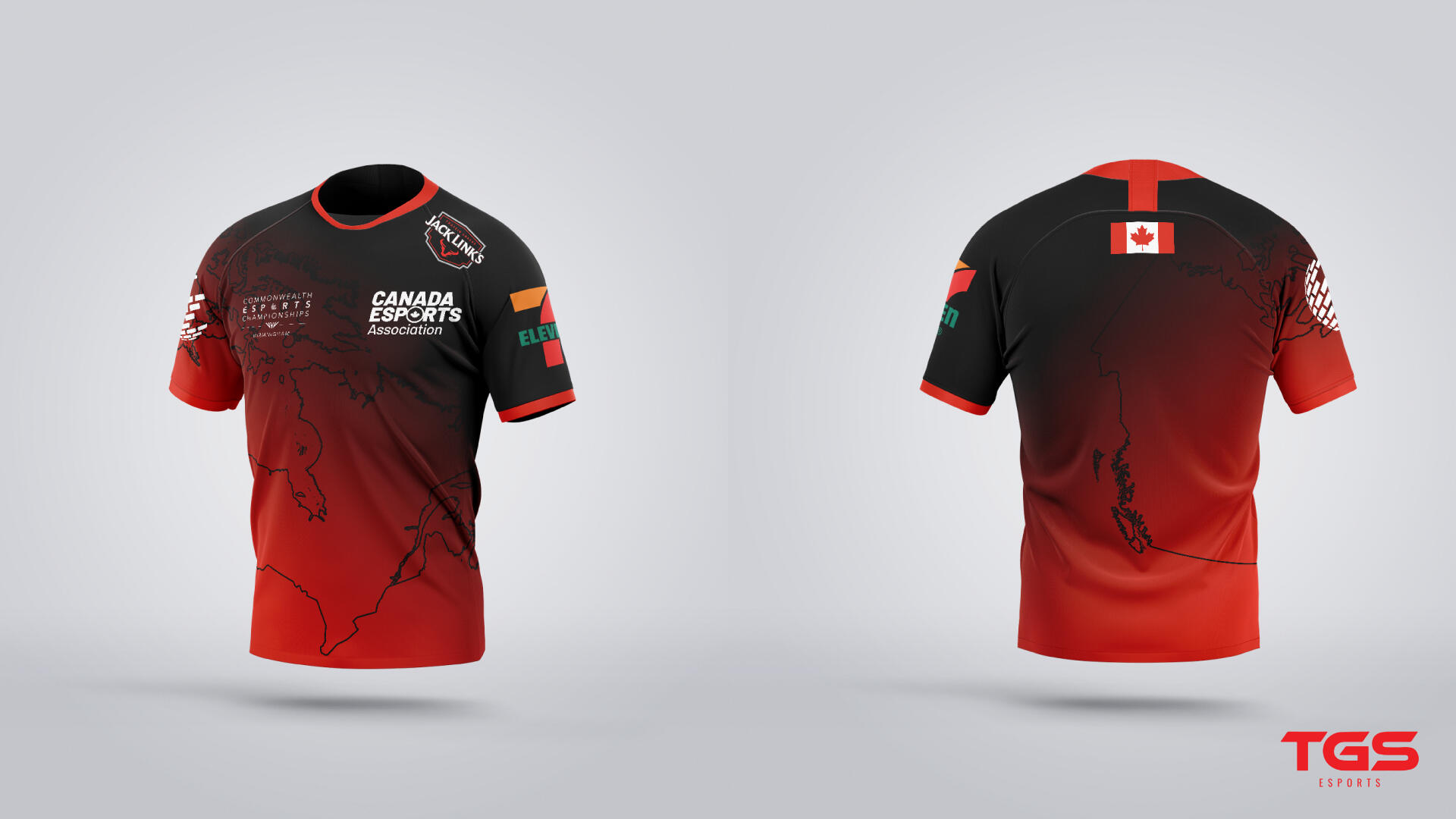 The definitive Canadian Jersey representing Team Canada at the 2022 Commonwealth Esports Championships: featuring the best international talent in Fifa, Rocket Leauge and Dota 2. Representing Canada in Birmingham, presented by Canadian Esports Assocation and TGS Esports, is the Open Team and the Women’s Team for Rocket League. A red to black gradient to create an esports visual that invites the traditional Canadian red. Across the jersey: the map in Canada as an all encompassing emblem of an expansive, diverse country and its collective commitment to performing on the world stage. Upon the presenting sponsor and partner logos: a Canadian flag resting at the nape of the neck as a point of unison and pride in chasing the gradient throughout the jersey.Canada in Birmingham would solidify its presence as a pleasantly fierce force with the Women’s Rocket League team making it to the big stage for Day 2.Go Team Canada!watch here