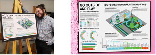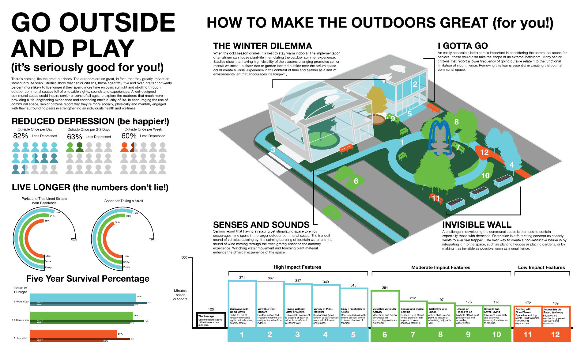An Infographic of a suggested design for the new Kerby Centre facility in Calgary, Alberta. Data suggested that seniors who had freedom and space to be outdoors or among nature have a higher level of happiness and wellbeing. The design explored impact features and resistances that seeked to explain what features within a space increased the average time spent outdoors.Canadian specific features were explored such as that of “inviting the outdoors” indoors via smaller indoor park area and plenty of windows for the colder seasons.