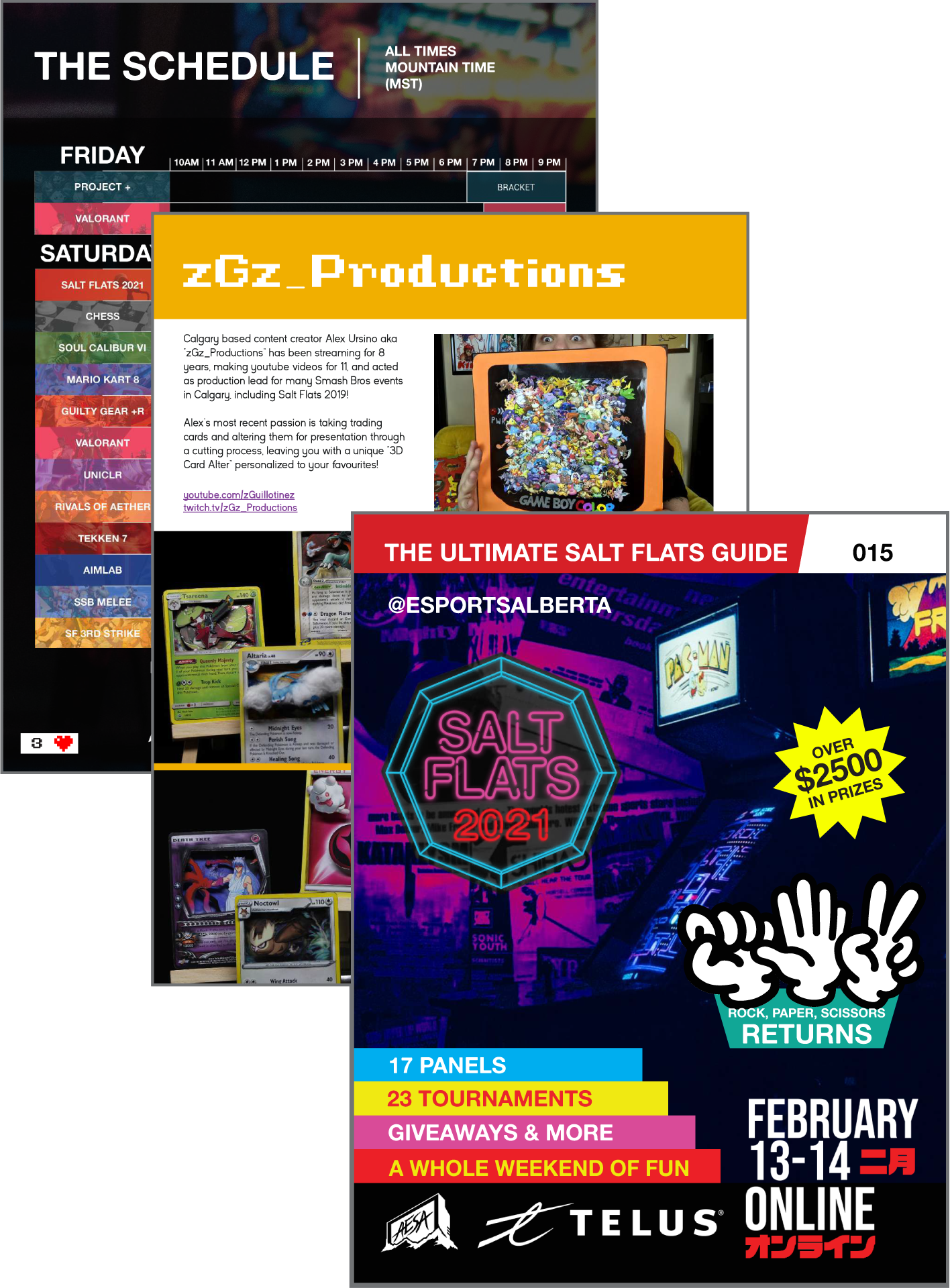 Taking Calgary’s premiere esports event online - the Salt Flats experience continues online. Salt Mines brand was created in defining the “transformative” space that has become online local events. Broadcast and stream assets developed to be used for livestreaming the tournament over the weekend. Provided continued expertise and advisory throughout the event: coordination, equipment and online troubleshooting.Panels were coordinated to fit a timely schedule: 3D printing, Rivals of Aether character creation, retro game speedruns and - as tradition - an event wide rock, paper, scissors tournament along with a myriad of other games or panels. Event stream was edited, produced and archived to Alberta Esports Association social media platforms with accompanying content ie. thumbnails.watch here