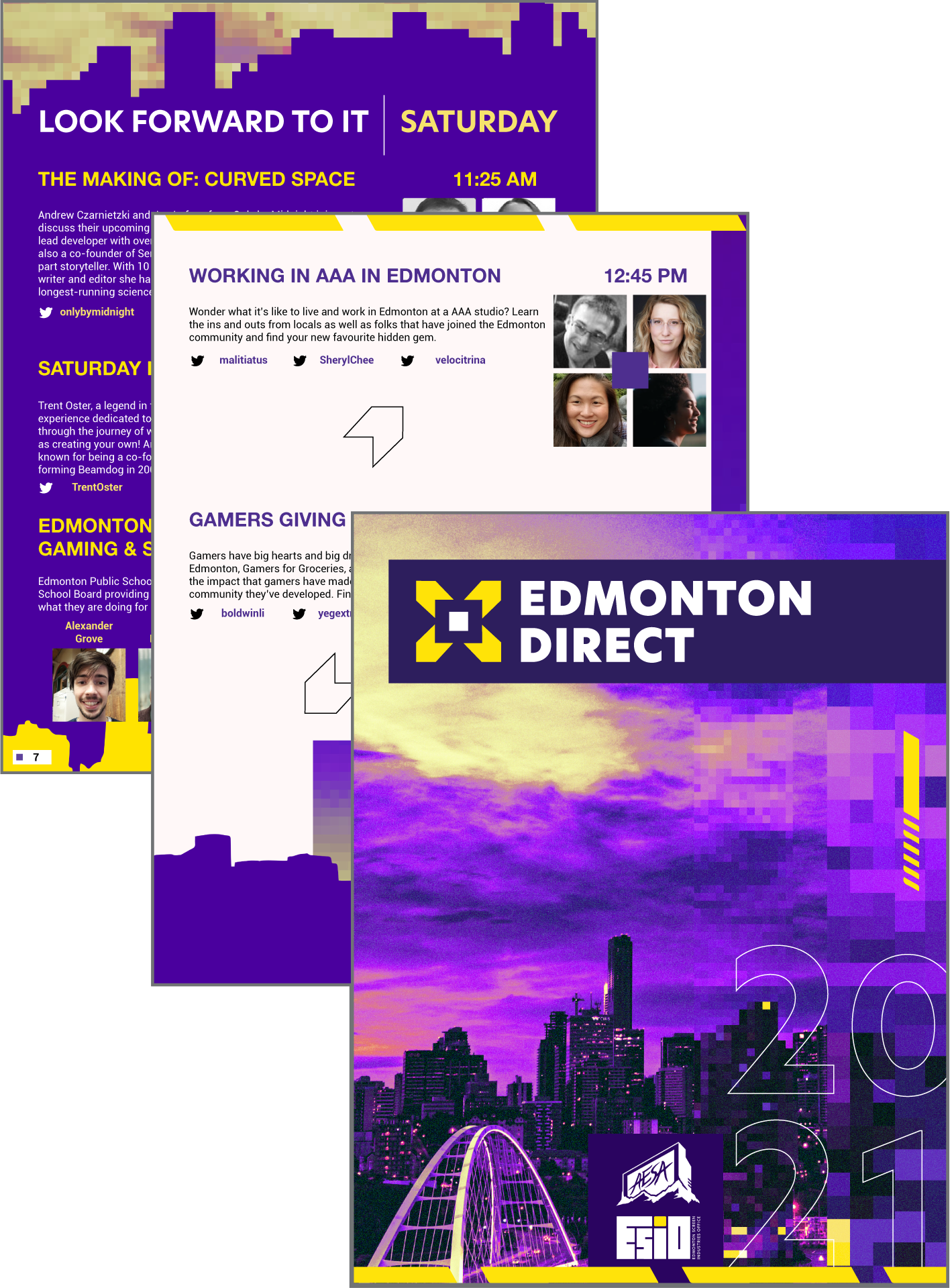 Edmonton Direct features Albertan talent in the games industry and enables conversation, innovation and interest within the community. Designed and inspired by Nintendo Direct online, a longer pre-recorded broadcast plays over a couple days featuring talks with some of the best in gaming close to Alberta. The Edmonton Direct guidebook was designed as a guide to the digital broadcast event and to act as a form of keepsake from the event for those who would receive a physical copy and features a myriad of visuals and content aligned with the Edmonton Direct brand.view online here