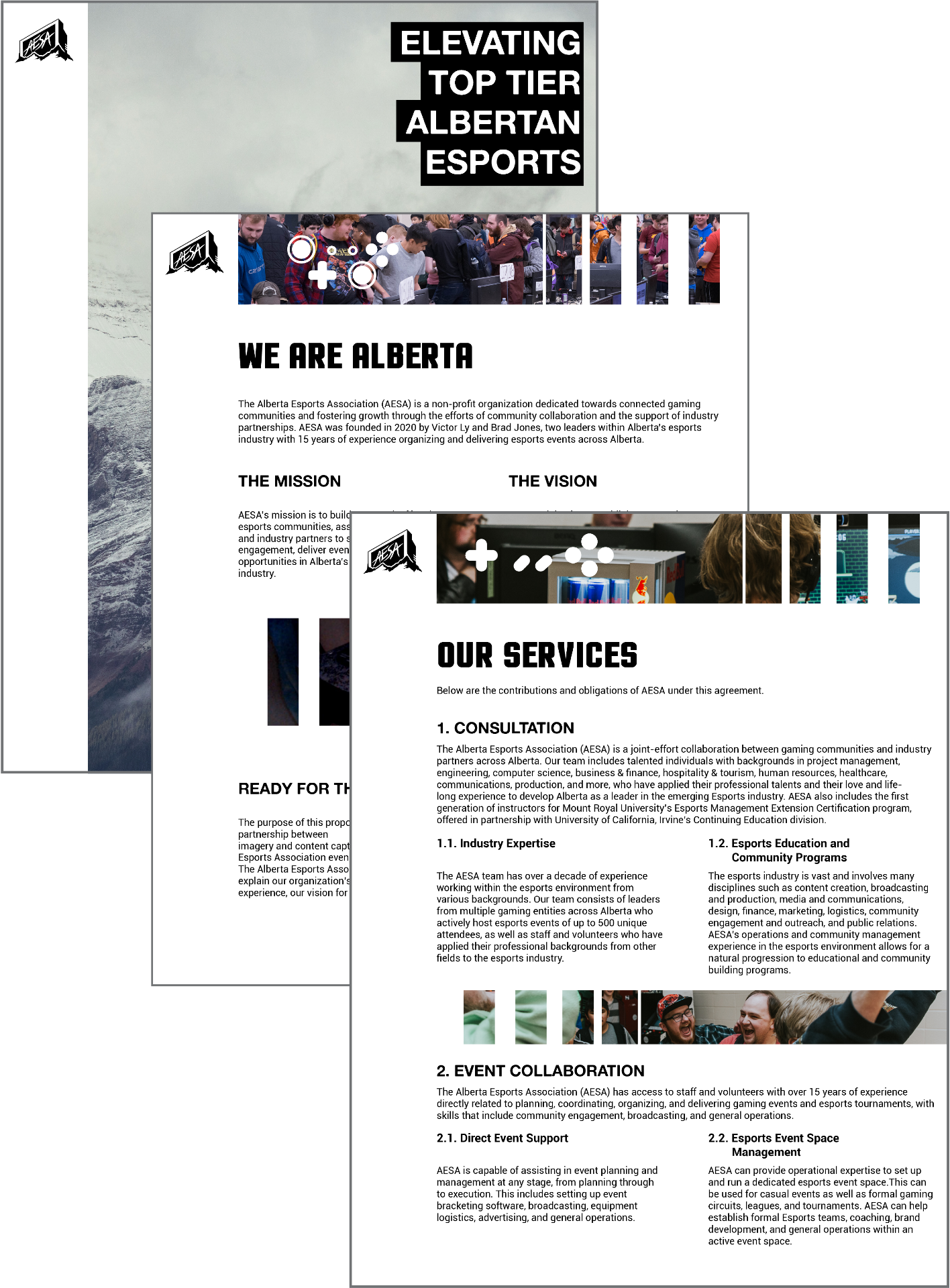 Portfolio development used alongside proposals. Acts as a visual representation of brand cohesiveness fitting the style guide for the association. Communicates the objectives, vision and effort of the collective as a non-profit body looking to represent esports in Alberta, Canada. Uses original imagery and content captured throughout Alberta Esports Association events and efforts.Uses original imagery and content captured throughout Alberta Esports Association events and efforts.esportsalberta.ca