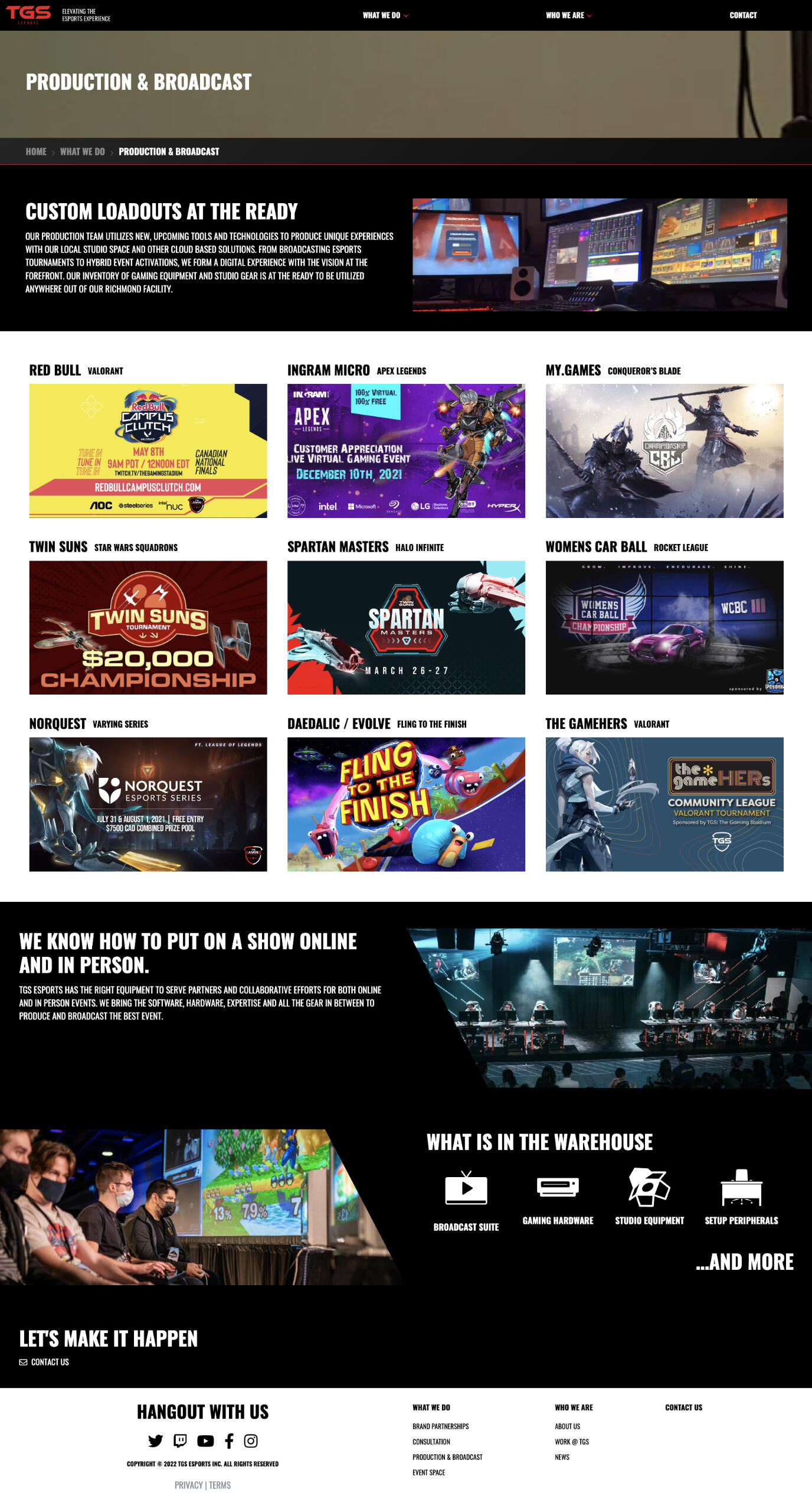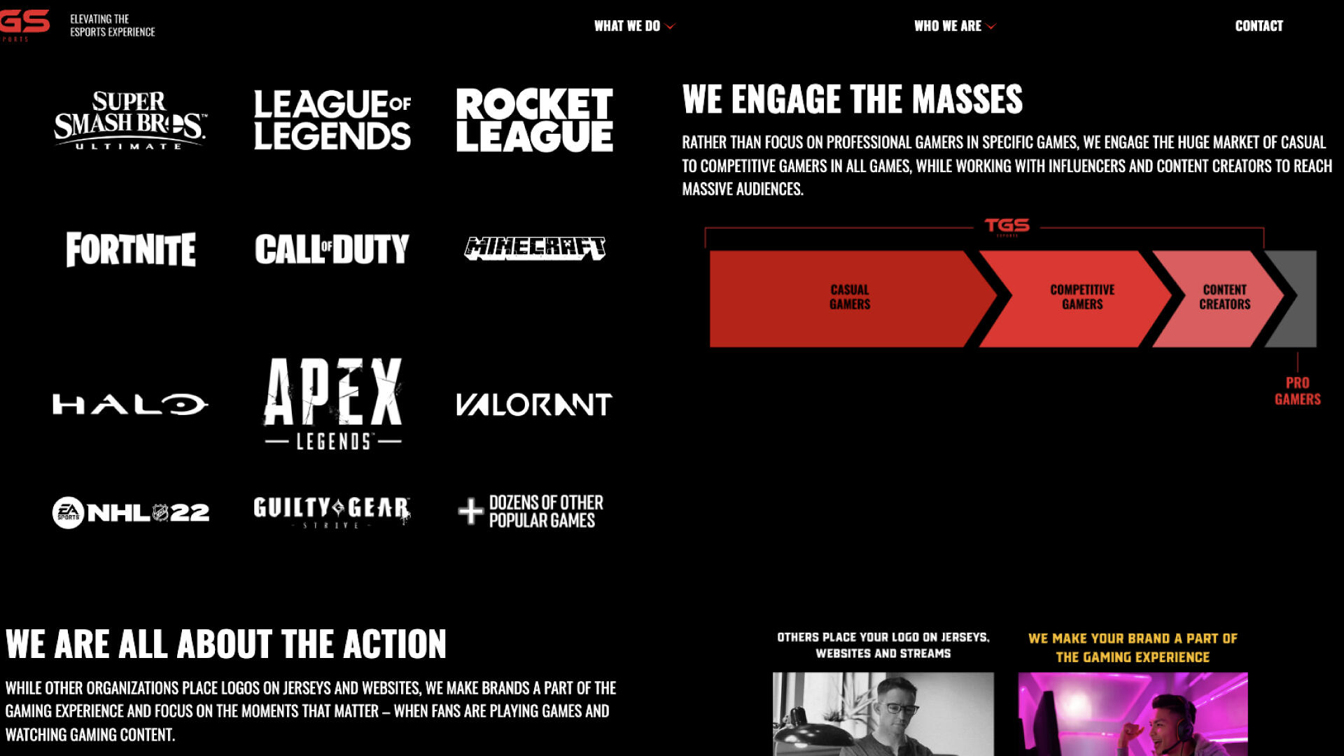 Transitioning from The Gaming Stadium to TGS Esports, a new site was in order to round out a brand refresh. Communicating new objectives, business direction, culture and discussing TGS Esports as the all in one gaming solution; elevating the esports experience. Pepper as a tournament organizing brand of TGS Esports is showcased front and center with a rotation of ongoing, available esports tournaments. TGS Esports highlights the store of who, what, why in a vibrant, new aesthetic and eloquently scrolls to a call to action: let’s get the party started, contact us.Completed product of the site design included, but were not limited to: redefined site map, complete desktop site design, curated event or gaming icons and photography, other imagery curation, definitive branding guidelines and general design consultation.see here