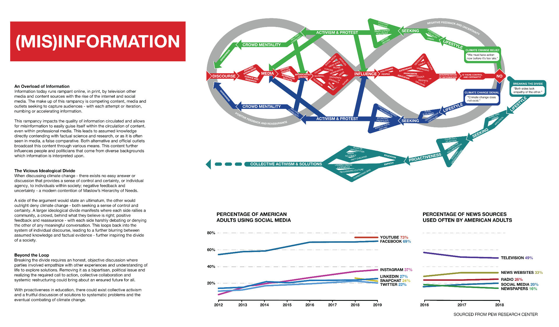 An Infographic featuring a system map which demonstrates the current flow of modern information correlating with the rise of news and media alternatives, primarily in that of social media. Now, more than ever, societies are dealing with a rampant acceleration of information with the coming of social media - straining individuals and their ability to understand, disseminate and consider information and misinformation guised as being factual.Data and research would suggest the flow of information and how people perform activism is consistently looping - with education, empathy and understanding being the only possible reform to shift of close ideological divides.