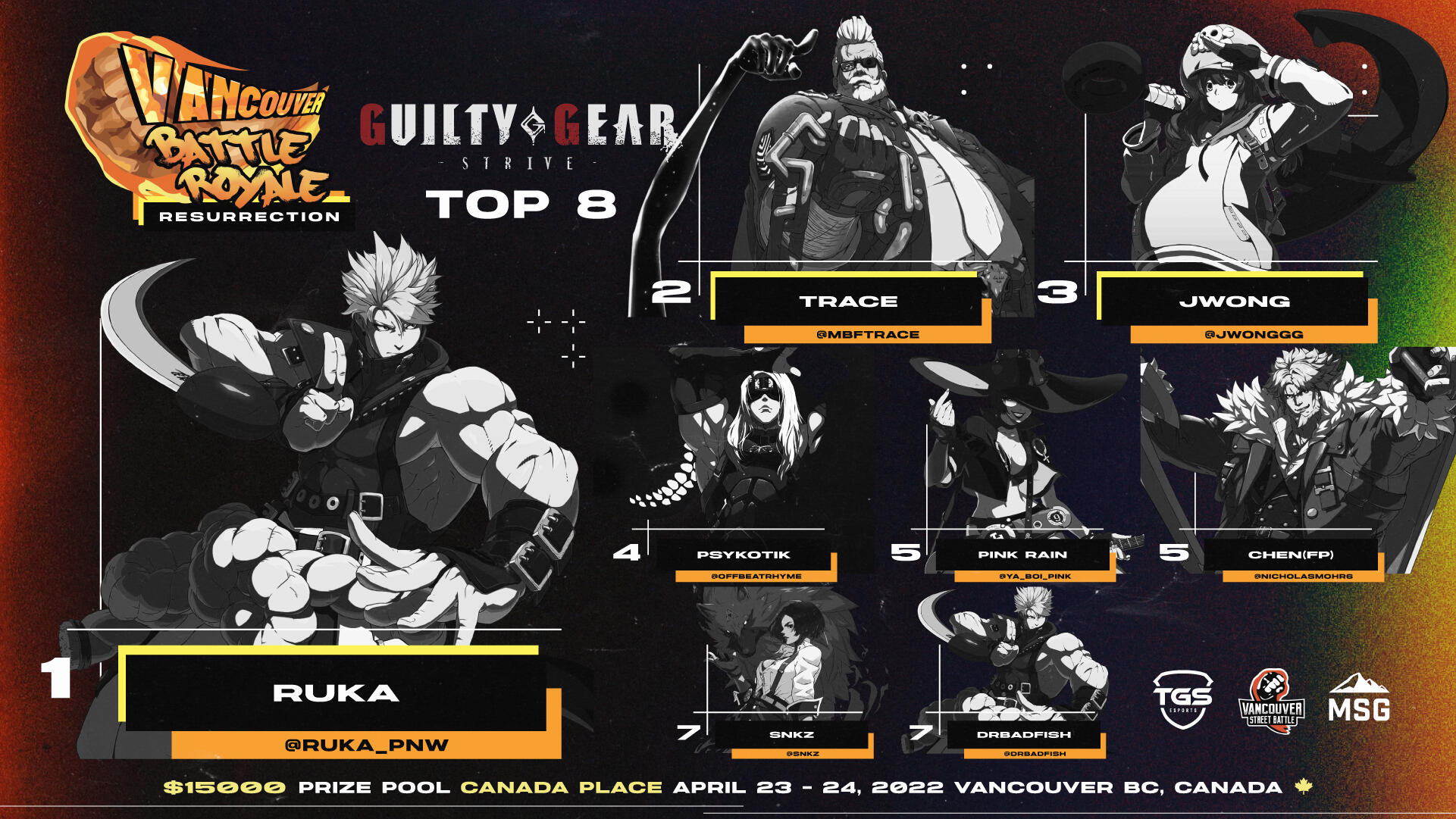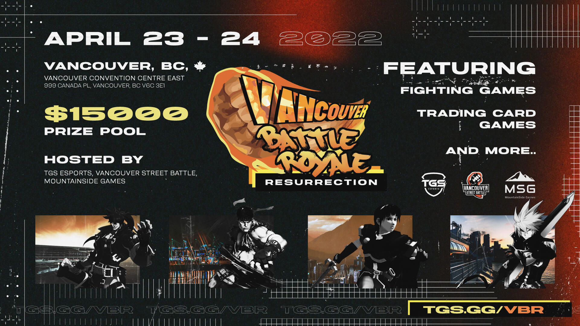 A fighting game favorite gets resurrected in 2022. Brought to you by Vancouver Street Battle and hosted by TGS Esports, the regional Vancouver Battle Royale series returns to BC. Existing identity features the traditional VBR logo: a flaming fist similar to that of the VSB logo notable to the community. The return of this branding would include the subtitle of “resurrection” and be accompanied by visuals of a similar palette of orange and black. A film burn aesthetic complimented by patterning, lines and outlines crafts the visual experience of VBR. Imagery of Vancouver adapted to the palette coupled with overexposed video game character assets announces, and matches, the games and design of VBR Resurrection.Final deliverables included tournament graphics, social media promotional content, signage and posters, winners or top 8 visuals, content addons, broadcast assets including animated visuals and completed showbuild as a VMix stream asset.watch here