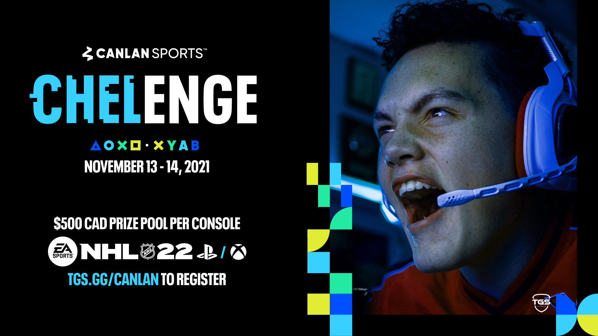 Canlan Sports dives into esports with Chelenge: an NHL 22 online esports tournament in collaboration, and partnership, with TGS Esports. Utilizing the ready-made Chelenge identity by Canlan and Canlan brand guidelines, broadcast and social media assets were to be developed. Core features of the Canlan identity were adapted to assets: brightly colored shapes, alternating text colors and use of familiar hierarchies as per guideline usage.Final deliverables included tournament graphics, social media promotional content, content addons, broadcast assets including animated visuals and completed showbuild as a VMix stream asset.