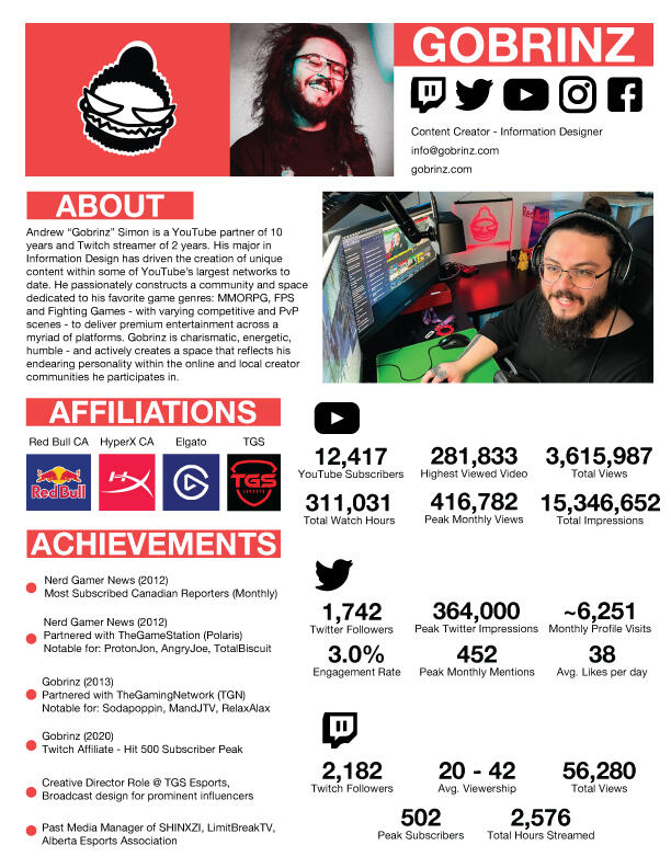An adventure in new media. The online persona of Andrew since 2011. Gobrinz was once the host of Nerd Gamer News, a gaming news show exclusively on YouTube. Nerd Gamer News was a partner of The Game Station (now Polaris). The show was discontinued in 2015 when Gobrinz decided to focus on more niche gaming content, in partnership with The Gaming Network at the time. In 2017, he decided to transition experiment in livestreamed content gaming content.Today, he streams select games throughout the week as an independent influencer. He continues to upload livestream highlights, reviews and specials on YouTube.**Active projects seen on **gobrinz.com.