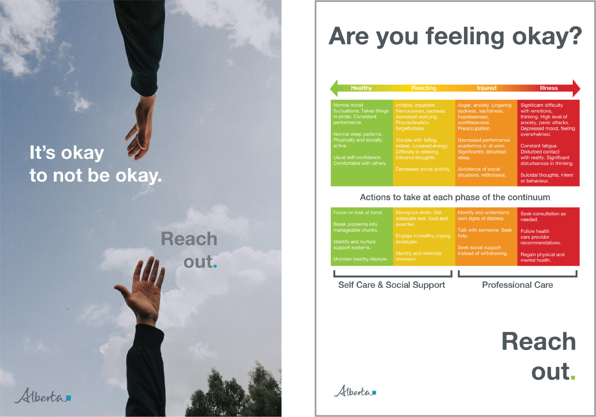 Peer support posters and accessible peer support resources for Calgary Correctional Facility Officers. A specialized CCF Peer Support binder was passed off as a resource - being mildly outdated and inaccessible. This peer support resource was entirely overhauled, updated and redesigned to be more visually engaging and readable. Posters were designed to reflect the outreach of the overhauled resource: “It’s okay to not be okay. Reach out.”This would seek to encourage those silent about their deteriorating mental wellbeing or encouraging those feeling vulnerable to ask for help within the workplace.