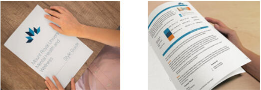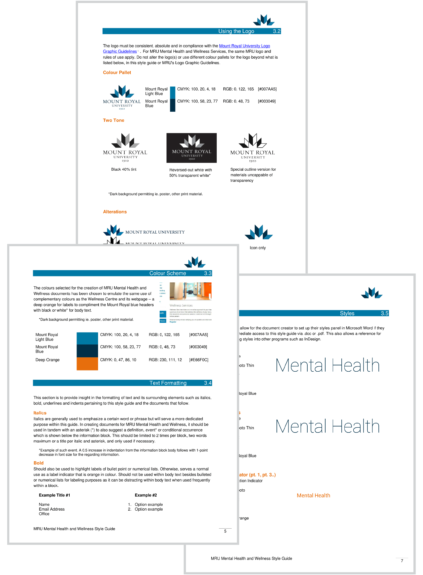 A developed style guide for Mount Royal University Mental Health and Wellness Services. Style guide considers design conventions, writing conventions, number conventions, purpose and identification in creating unity across all Wellness Service documents. A formally designed document that contains all appropriate information with each label properly placed within its appropriate label and part.The style guide itself demonstrates a considered use of hierarchy and composition within its proposed structure and design conventions.