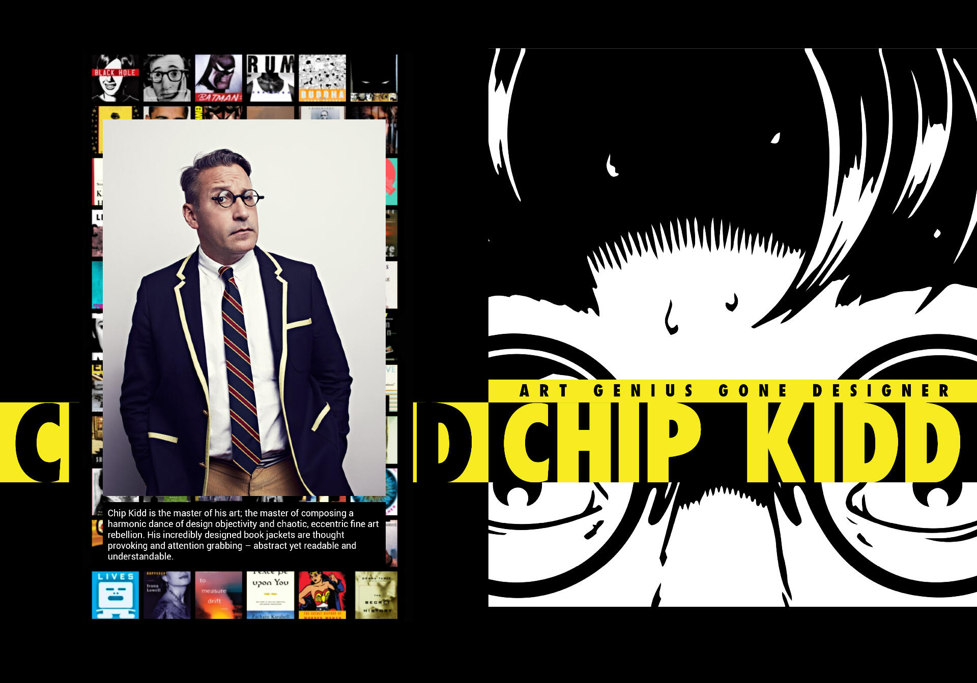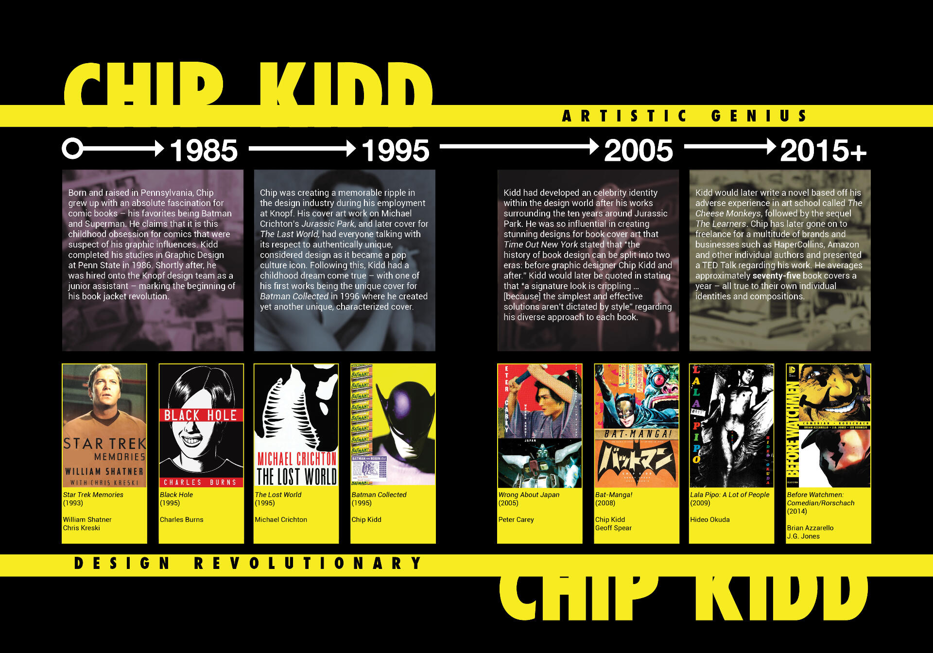 Study, consideration and recreation of the aesthetic or stylistic design choices of Chip Kidd into a double sided spread. Research and content is developed to discuss the journey of Kidd and his development as a creative. Spreads are developed with consideration to the comic book series “The Watchmen” as it is one of Kidd’s notable pieces of work in developing the cover of the comic.Timeline content depicts the journey of his designed cover work and addresses notable moments within his design career.