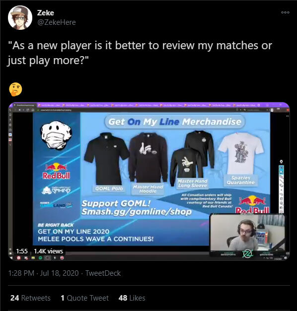 Social media management and content curation for @ZekeHere, a professional Super Smash Bros coach, on behalf of Red Bull Canada during Get On My Line 2020 - a Super Smash Bros tournament taken online, more commonly known as Get On My Level. Clipped, produced and posted varying clips of ZekeHere’s expertise reviewing event replays and notable moments to Twitter. Other content was also posted in an effort to achieve virality in specific occurrences aimed at the intended audience. The event spanned over the weekend of July 17th, 2020.click here for more - twitter